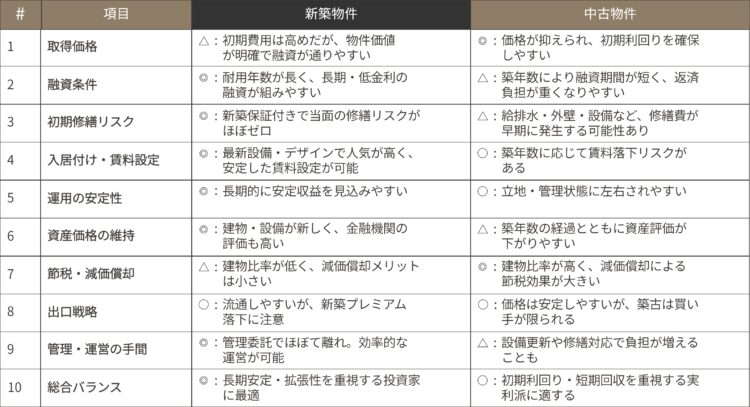 中古:◎ 価格が抑えられ、初期利回りを確保しやすい -