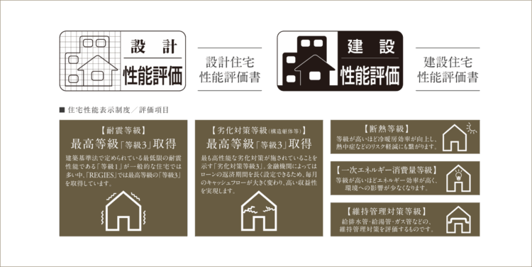 REGIESでは、耐震等級3・劣化対策等級3・住宅性能評価の取得など、長期保有を前提にした基本性能を重視しています。