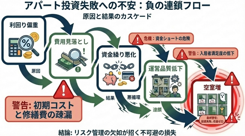 アパート経営への批判は、特定の失敗事例から生まれています。共通点ははっきりしていて、表面利回りだけを追い、実質のキャッシュフローや出口戦略を度外視したケースです。
