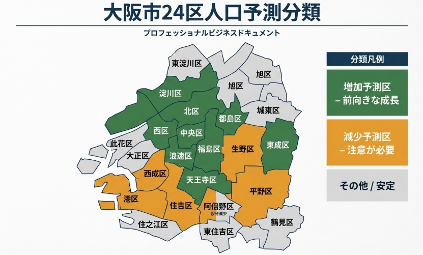 アパート経営の成否は、将来にわたる入居需要の維持で決まります。大阪市全体では人口減少が予測される一方で、区単位で格差が存在する、と整理されています。資料では、2015年から2045年予測の区分として、次の分類が示されています。