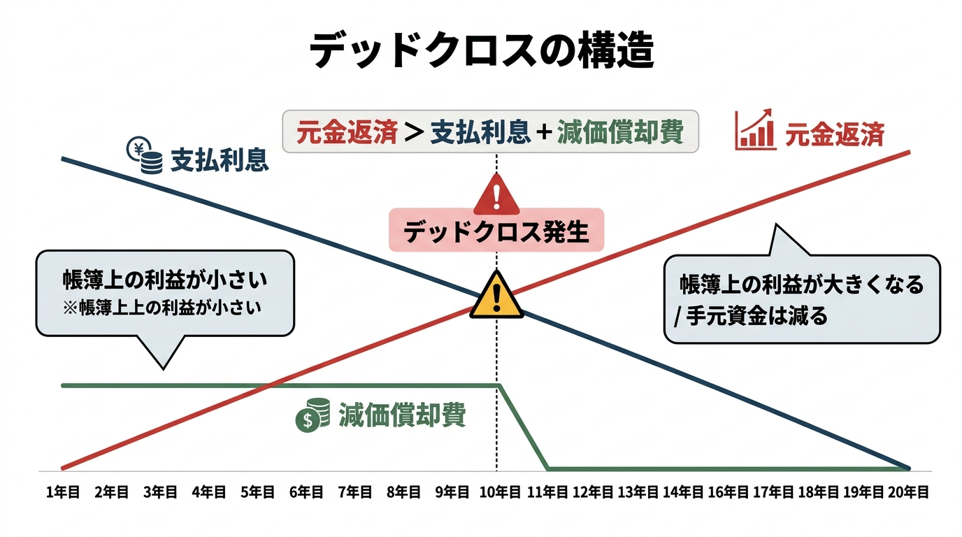 帳簿上の利益に対して税金がかかるため、手元に残る現金と課税所得がズレることがあります。とくにデッドクロスが始まると、このズレが一気に苦しくなります。