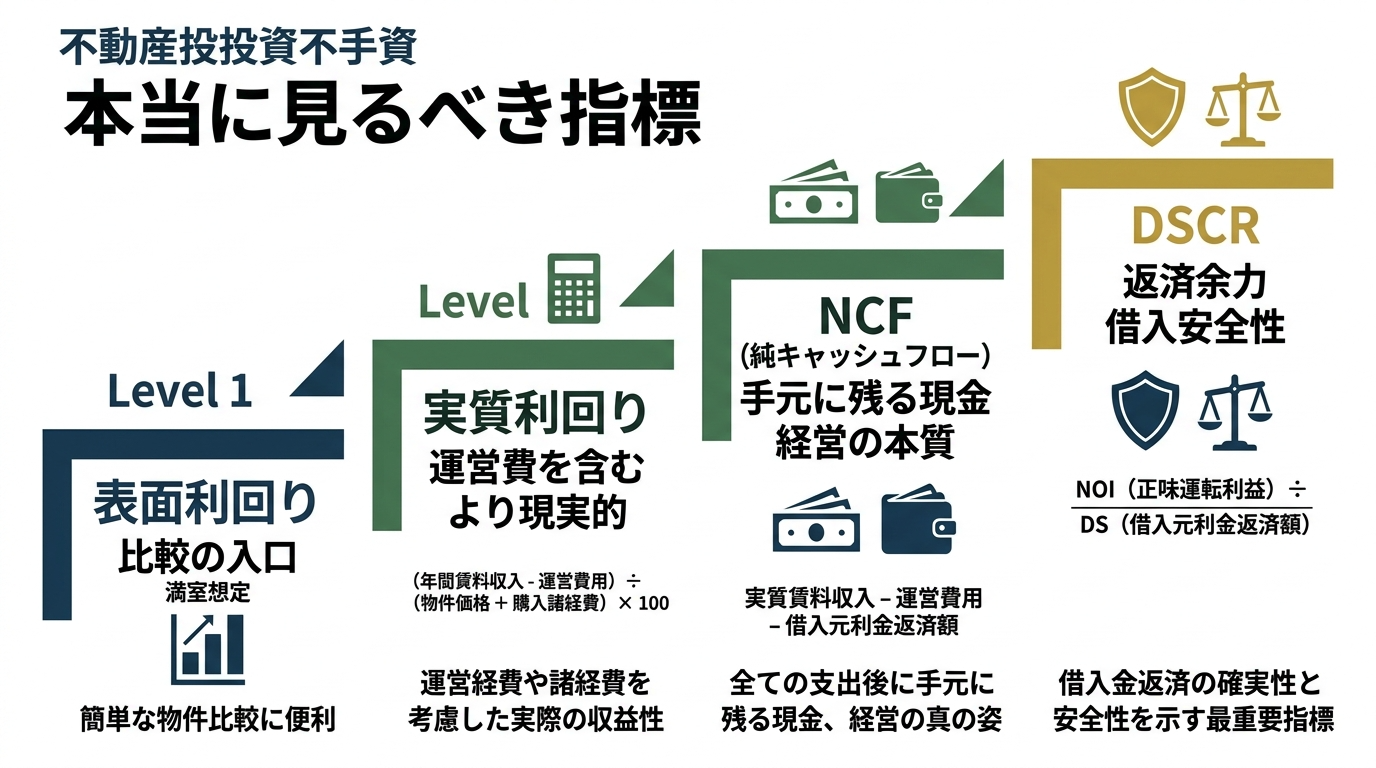 運営費や購入諸費用まで含めて、実際にどれだけ回るかを見る指標です。表面利回りの補正として必須です。