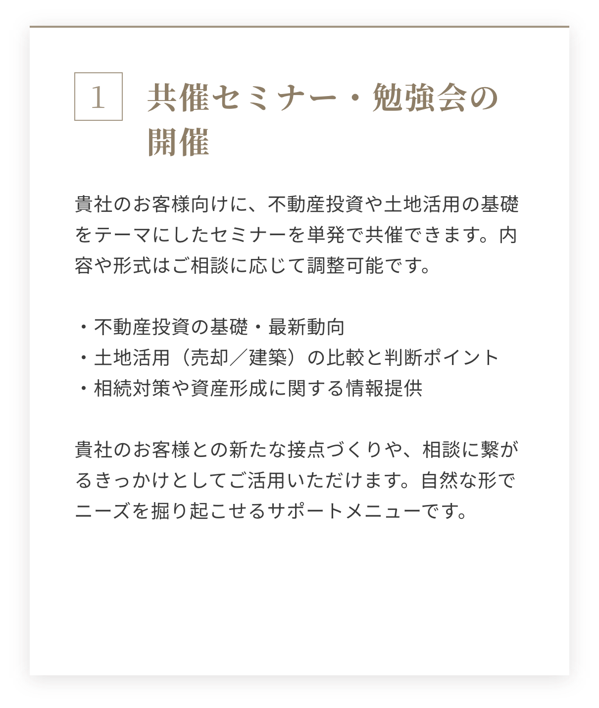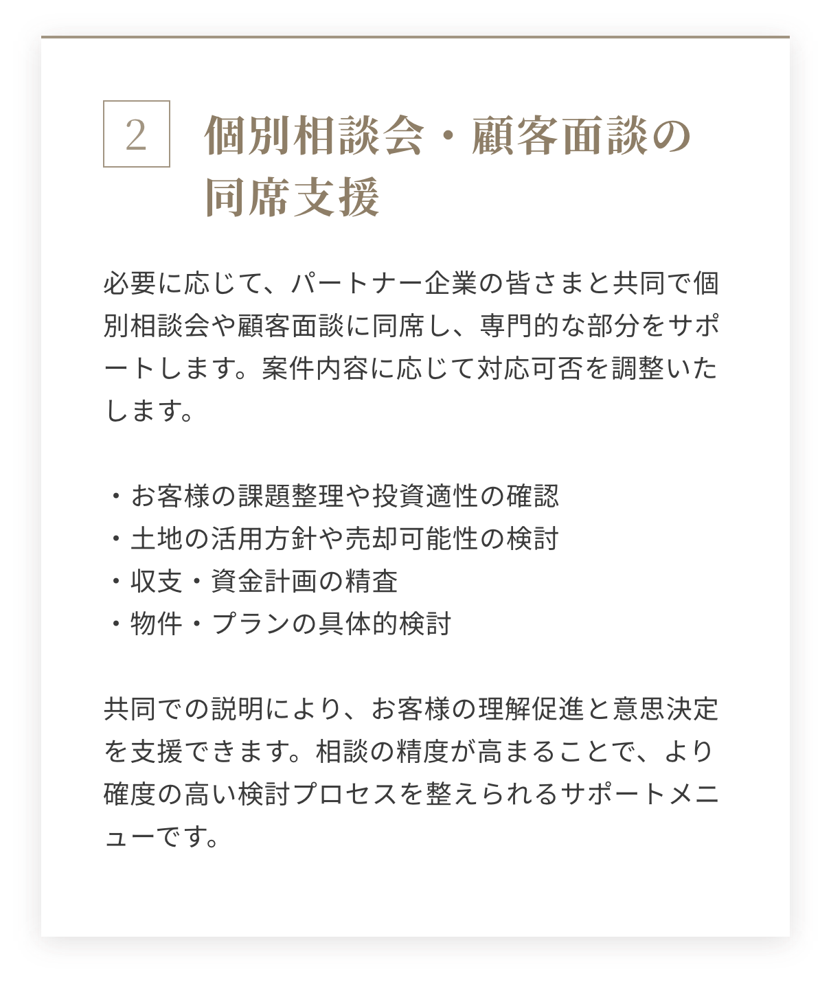 投資家・土地オーナーの皆さまからの相談において、「投資判断」や「土地活用の方向性」について中立的な助言が求められる場面が増えています。