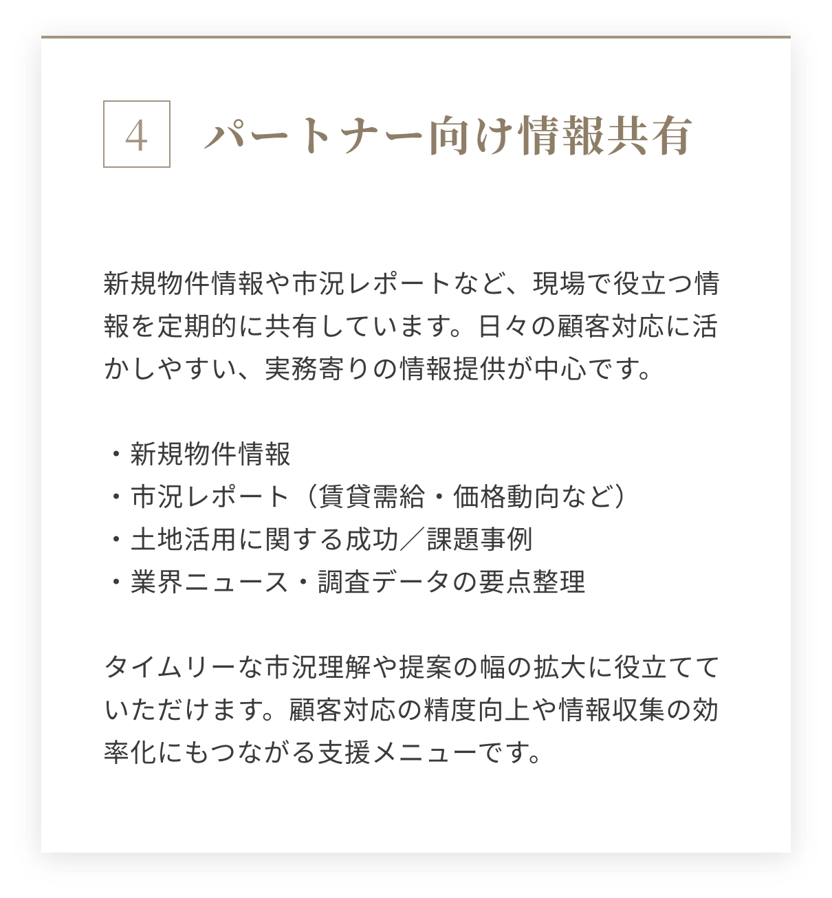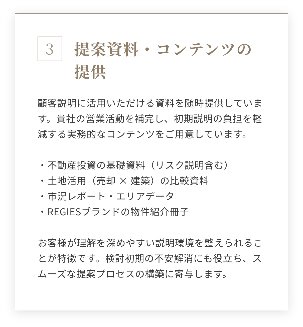 このような中立性の高いスタンスにより、土地オーナーは”納得して意思決定できる環境”が整い、結果としてパートナー企業に対する信頼向上にも繋がります。