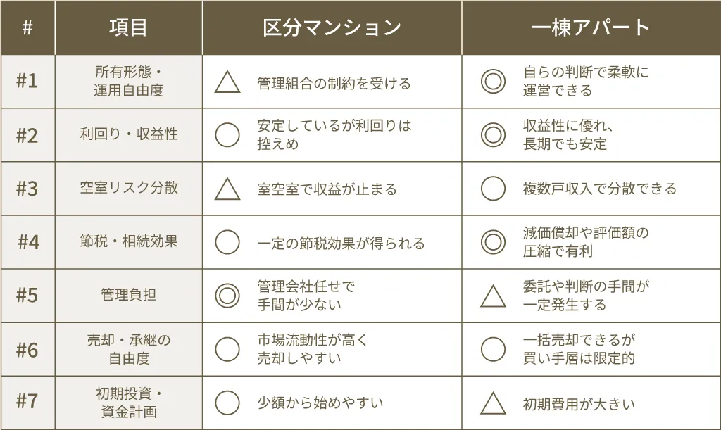 不動産投資にはさまざまな形があります。中でも、アパート経営と区分所有マンション投資は、よく比較される代表的な2つのスタイルです。それぞれにメリット・デメリットがあり、投資規模やリスク、運用の自由度も異なります。特徴を正しく理解し、自分の目的に合った資産運用の形を選ぶことが大切です。